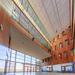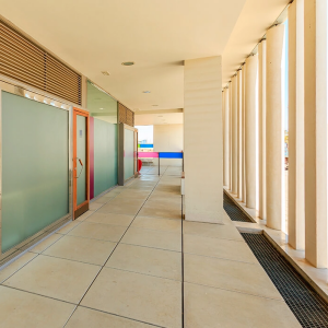 Située dans les ailes nord et est du bâtiment, elle bénéficie également de grandes façades vitrées vers l'extérieur, adéquatement protégées par des rideaux, qui baignent tous les espaces de lumière naturelle mais qui, en même temps, grâce à l'orientation pratique et au système de persiennes architecturales, offrent le confort de la lumière indirecte et de l'ombre aux heures de fort ensoleillement.